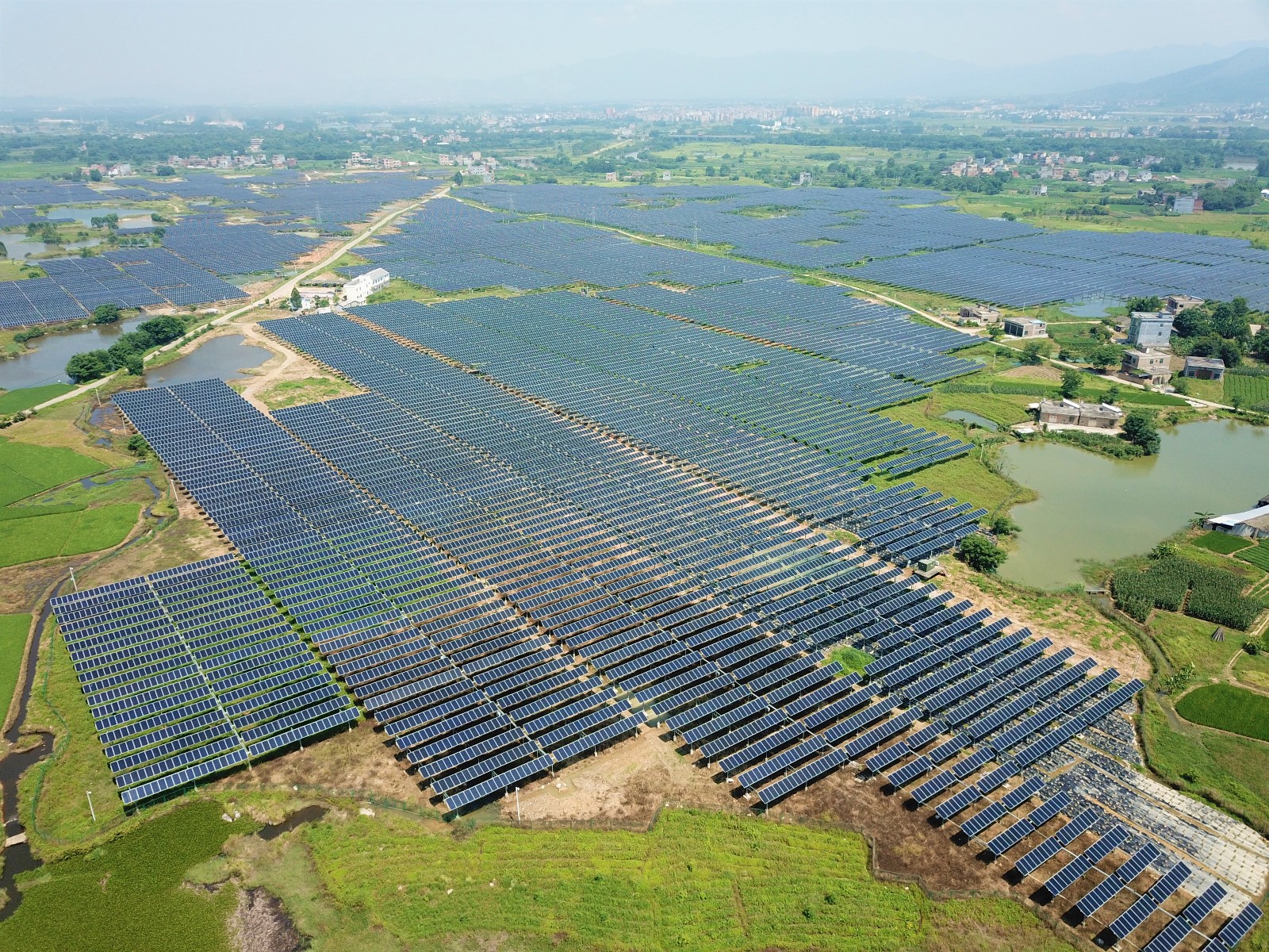 在廣西壯族自治區(qū)桂平市中部偏西,坡地上一大片高高架起的光伏藍(lán)板排列有序、十分顯眼,空中俯瞰猶如一汪藍(lán)色海洋,蔚為壯觀,與四周環(huán)繞的綠色田野構(gòu)成了一幅壯美和諧的生態(tài)畫卷。