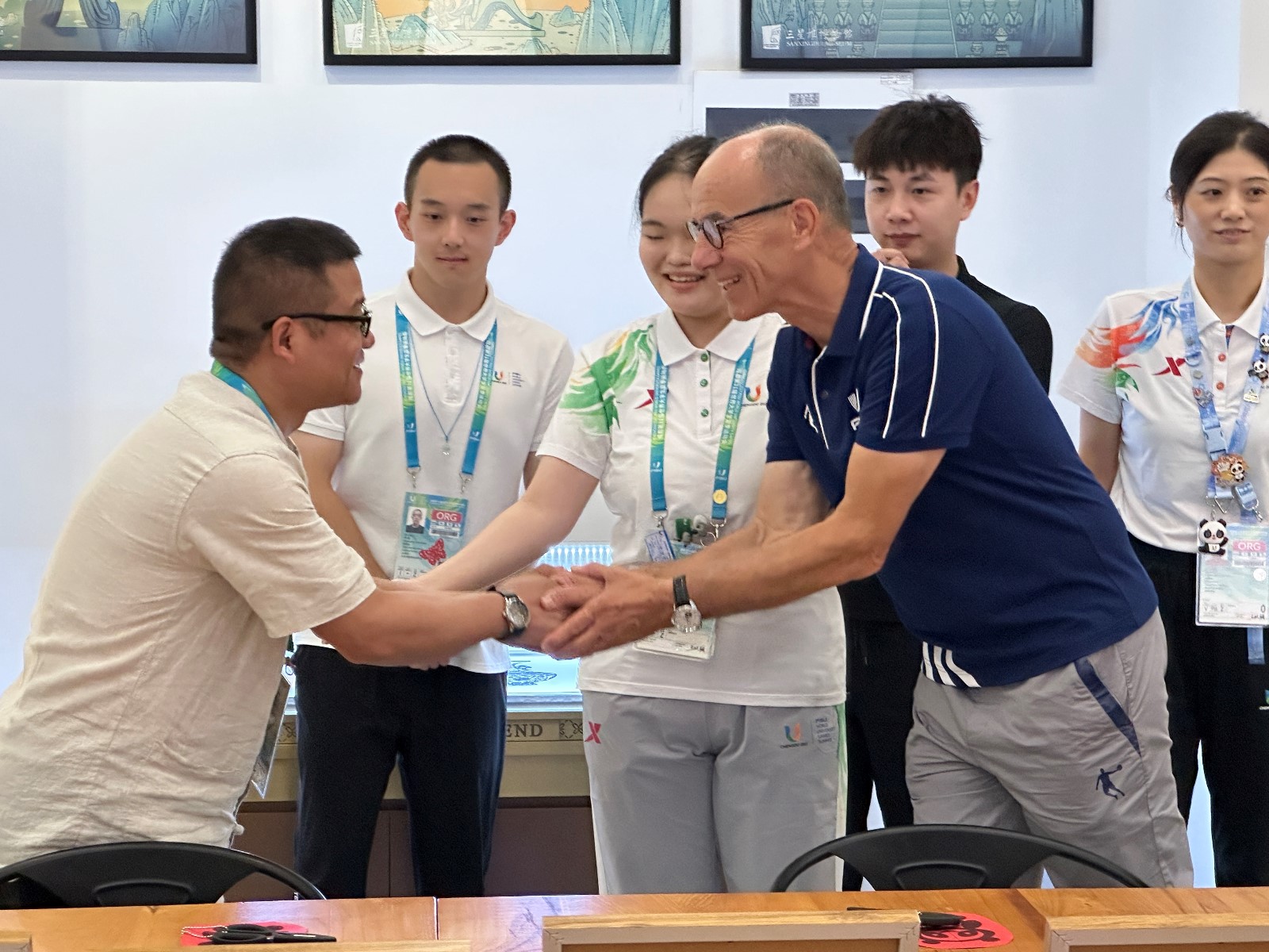 莊叢燦的剪影作品和其耐心負(fù)責(zé)的剪紙教學(xué)倍受運(yùn)動(dòng)員們“點(diǎn)贊好評(píng)”的同時(shí),也吸引了國際大體聯(lián)和各國代表團(tuán)人員前來“沉浸式體驗(yàn)”。期間,莊叢燦為國際大體聯(lián)代理主席雷諾·艾德和意大利代表團(tuán)官員彼得羅·伊瓦爾迪進(jìn)行剪紙教學(xué)和剪影留念。