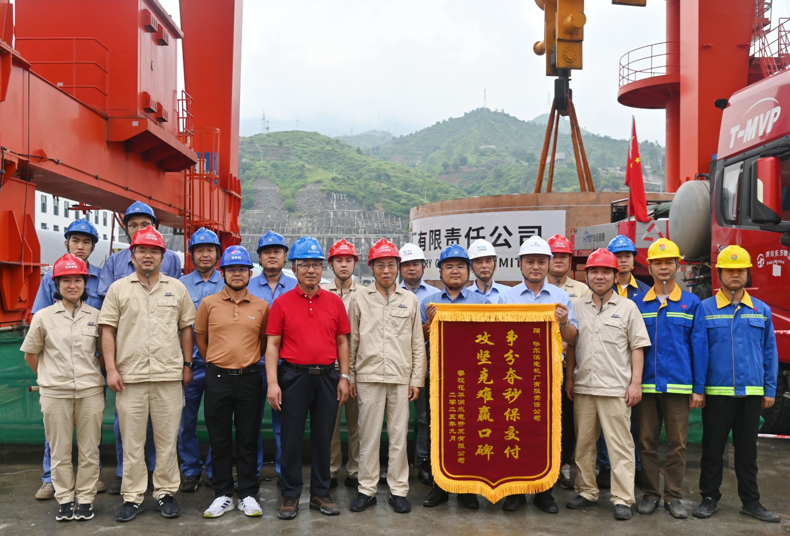 26日上午,現(xiàn)場(chǎng)各單位立即投入到吊裝前的準(zhǔn)備工作中。攀水電公司全程跟進(jìn)機(jī)電安裝進(jìn)展,逐一確認(rèn)安裝條件;施工單位技術(shù)人員按吊裝方案全面落實(shí)安全交底與技術(shù)措施,確保萬無一失;在各項(xiàng)準(zhǔn)備工作全面就緒的基礎(chǔ)上,6號(hào)機(jī)組的轉(zhuǎn)子支架平穩(wěn)、精準(zhǔn)吊裝就位。川投能源副總經(jīng)理、攀水電公司黨總支書記、董事長(zhǎng)徐孝剛現(xiàn)場(chǎng)督導(dǎo)吊裝工作,充分肯定了哈電公司在本次極端條件下的運(yùn)輸成績(jī),并向哈爾濱電機(jī)廠有限責(zé)任公司授予錦旗,感謝其長(zhǎng)期以來對(duì)銀江水電站建設(shè)的大力支持。