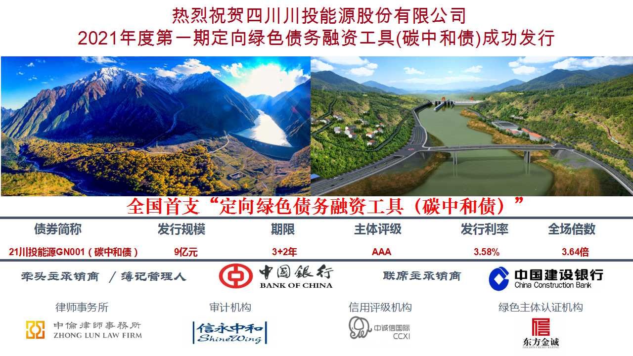 2021年7月15日,四川川投能源股份有限公司成功發(fā)行2021年度第一期定向綠色債務(wù)融資工具(碳中和債)(簡(jiǎn)稱:21川能投GN001,代碼:q21071406.IB),本次發(fā)行金額9億元,期限3+2年,票面利率3.58%,屬目前同期限同定向債務(wù)融資工具的全國最低價(jià)格。募集資金將專項(xiàng)用于收購?fù)ぷ涌谒こ添?xiàng)目20%股權(quán)。