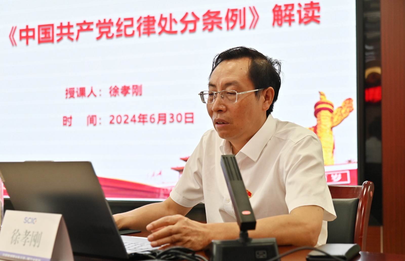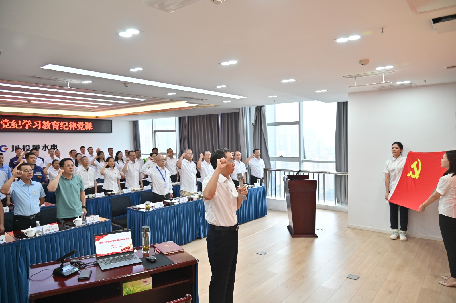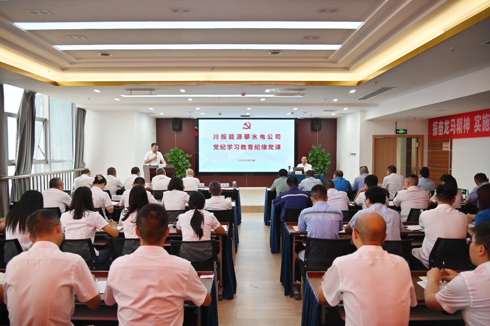 在全黨開展黨紀學(xué)習(xí)教育和黨的103歲生日來臨之際,按照川投能源黨委和攀水電黨總支的安排部署,6月30日上午,川投能源副總經(jīng)理、攀水電公司黨總支書記、董事長徐孝剛講授了黨紀學(xué)習(xí)教育紀律黨課并宣講省委十二屆五次全會精神,公司全體員工、參建單位負責(zé)人及黨員代表共計50余人參加。