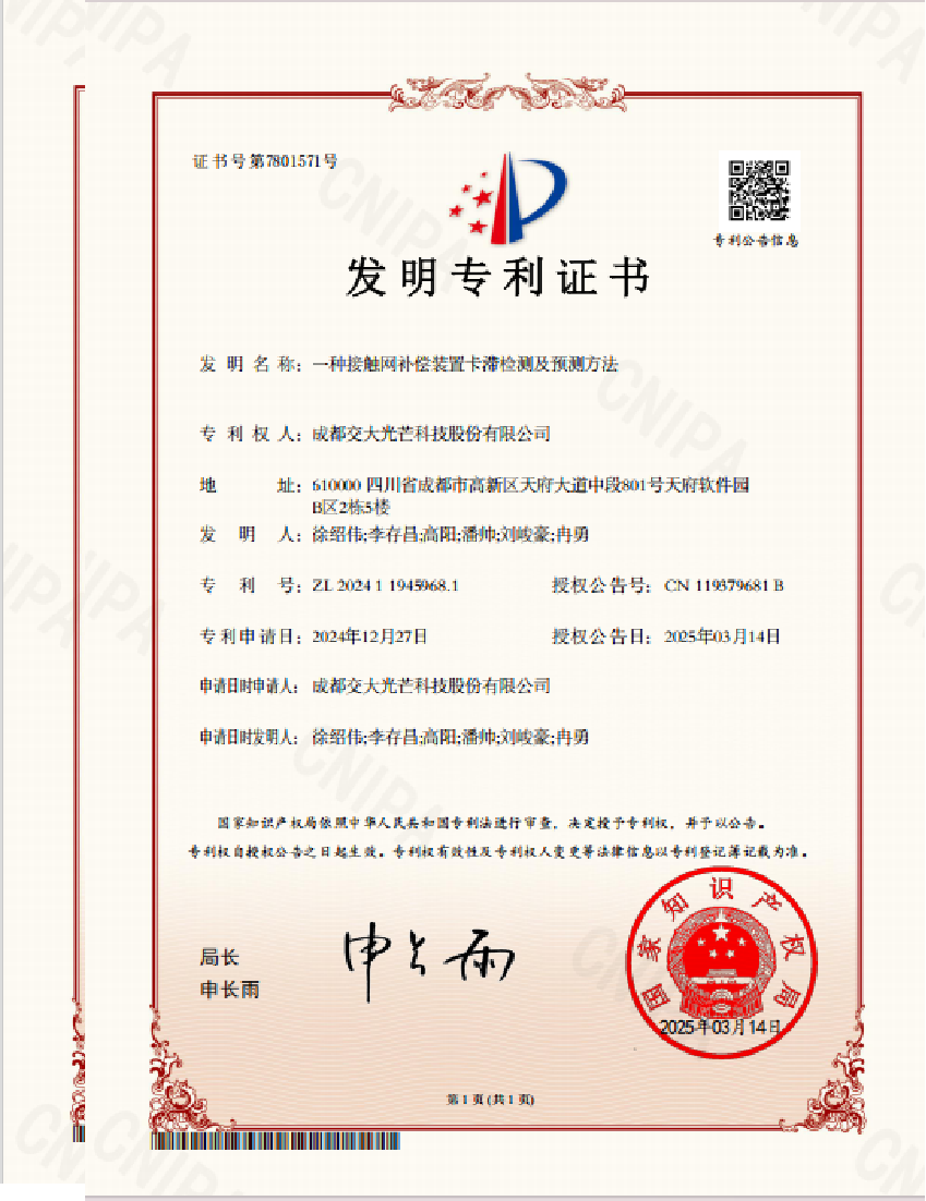 近日,川投能源所屬交大光芒公司“接觸網(wǎng)補償裝置卡滯檢測及預(yù)測方法”和“基于多維數(shù)據(jù)的列車融合定位方法”兩項創(chuàng)新技術(shù)獲得國家知識產(chǎn)權(quán)局發(fā)明專利授權(quán)。截至目前,交大光芒鐵路接觸網(wǎng)檢測監(jiān)測智能化相關(guān)創(chuàng)新技術(shù)累計獲得發(fā)明專利授權(quán)達到9項,另有多項創(chuàng)新技術(shù)已申請發(fā)明專利并獲受理。