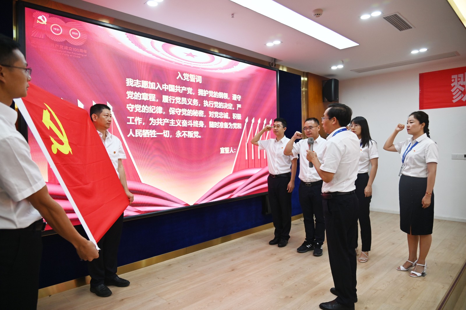 大會在雄壯的國歌聲中拉開帷幕,與會人員一起觀看建黨百年微視頻《路》,共同回顧了中國共產(chǎn)黨帶領(lǐng)全國人民艱苦卓絕走過的這條跨越百年、走向復興的光輝道路。隨后正式發(fā)布了公司首部宣傳片。黨總支委員、副總經(jīng)理吳巍嶼和副總經(jīng)理周軍分別傳達了川投集團、川投能源慶祝建黨100周年暨“七一”表彰大會精神。隨后,由徐孝剛領(lǐng)誓,新黨員進行了入黨宣誓,全體黨員一起重溫了入黨誓詞。